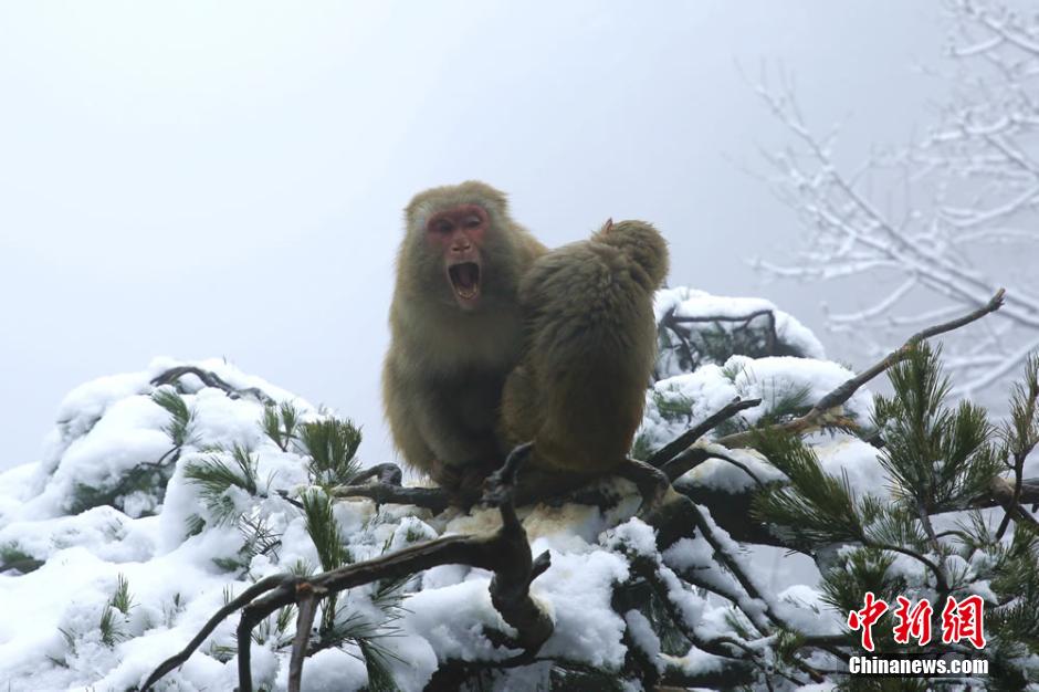 2月22日正值元宵佳節(jié),湖南張家界核心景區(qū)武陵源喜降春雪。在黃石寨景區(qū),成群的野生獼猴或在雪中追逐戲鬧,或在樹枝上攀爬跳躍,或蜷縮著身子賣萌,成為張家界武陵源的一道春季新景。吳勇兵 攝