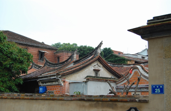 在大量的華僑洋樓建設(shè)中,體現(xiàn)出一些新風(fēng)尚:一方面,立面上采用紅磚墻與少量白色線條對(duì)比的手法蔚然成風(fēng),延續(xù)了閩南紅磚厝紅磚白石的裝飾傳統(tǒng);另一方面,以裝飾藝術(shù)風(fēng)格為代表的裝飾元素逐漸流行,并融合常見的傳統(tǒng)裝飾題材及西方古典裝飾元素。