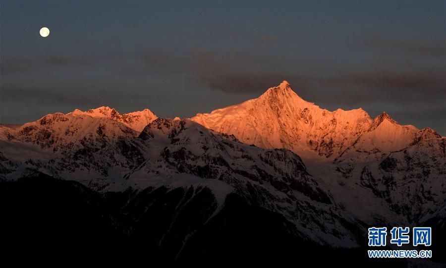 這是3月25日清晨拍攝的梅里雪山“日月同輝”景觀。梅里雪山位于滇藏交界的云南省迪慶藏族自治州德欽縣境內(nèi),是世界自然遺產(chǎn)“三江并流”的主要自然景觀之一。梅里雪山常年云霧籠罩,太陽光只在少數(shù)天晴的清晨照射在雪山頂上,形成絕美的“日照金山”美景。有時(shí)月亮尚未落山,太陽已經(jīng)升起,更是形成了難得一見的梅里雪山“日月同輝”奇觀。新華社記者 王長山 攝