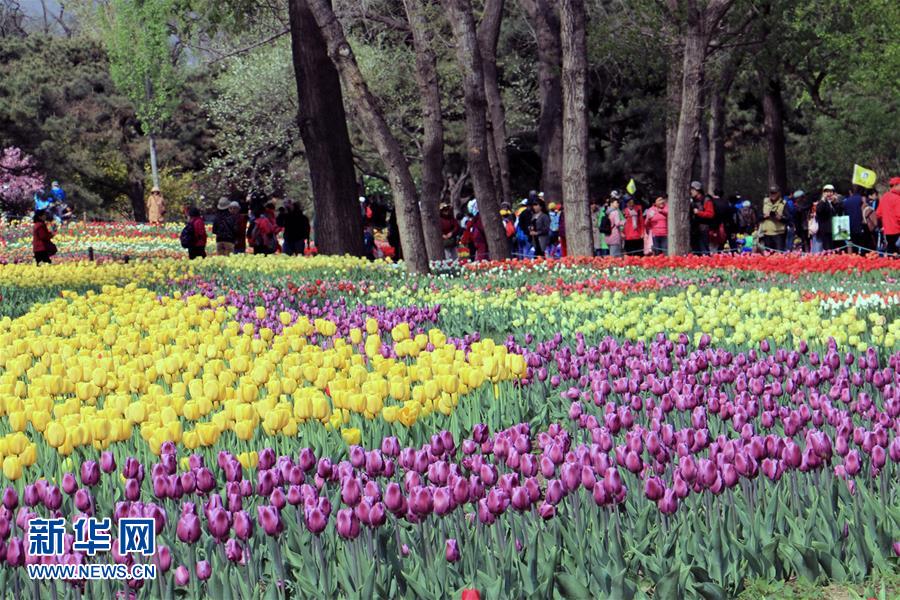 北京植物園內盛開的郁金香花(4月11日攝)。近日,北京植物園內的郁金香競相開放,吸引眾多游人前來觀賞。 新華社記者 李明放攝