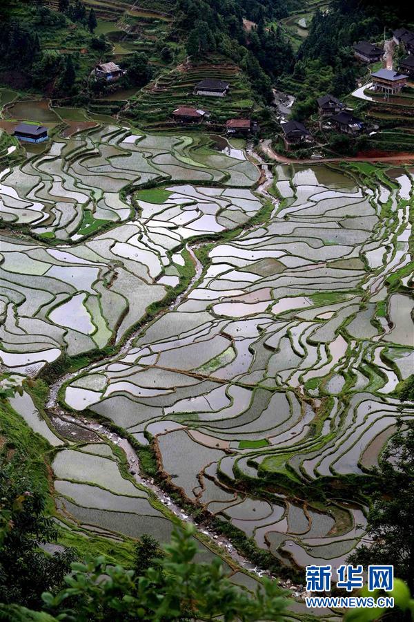 5月20日在廣西柳州市融水苗族自治縣桿洞鄉(xiāng)拍攝的梯田。廣西柳州市融水苗族自治縣桿洞鄉(xiāng)平均海拔780多米,是全縣高海拔鄉(xiāng)鎮(zhèn)之一。這里的梯田多在高山,人們稱之為“天上糧倉(cāng)”。時(shí)下,“天上糧倉(cāng)”或儲(chǔ)水待插,或新秧初栽,如織錦一般美不勝收。新華社發(fā)(龍濤 攝)