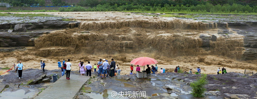 受上游強(qiáng)降雨和水庫放水影響,最近幾天,黃河壺口瀑布迎來伏汛,最大水流量達(dá)到每秒2600立方米左右,濁流滾滾奔騰而下,氣勢(shì)磅礴?。ㄑ胍曈浾呃钪?文豪)