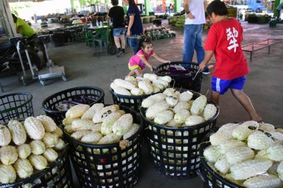 臺(tái)東在地苦瓜、絲瓜滯銷,價(jià)格下跌,在果菜市場(chǎng)幫忙的小朋友,請(qǐng)大家多采購好吃又便宜的苦瓜。(圖片來源:臺(tái)灣《中時(shí)電子報(bào)》) 苦瓜滯銷 瓜農(nóng)心里更苦 除了觀光產(chǎn)業(yè)受沖擊以外,大豐收的臺(tái)東當(dāng)?shù)乜喙?、絲瓜也受波及。據(jù)臺(tái)灣《中時(shí)電子報(bào)》報(bào)道,臺(tái)東果菜市場(chǎng)一簍簍的苦瓜已出現(xiàn)滯銷情形,批發(fā)價(jià)與6月底相比,慘跌5成。盤商表示,因?yàn)榇箨懹慰土看鬁p,一般餐廳、飯店蔬菜需求量變少,雖然有活動(dòng)吸引不少游客到臺(tái)東,但仍不足以彌補(bǔ)差額。