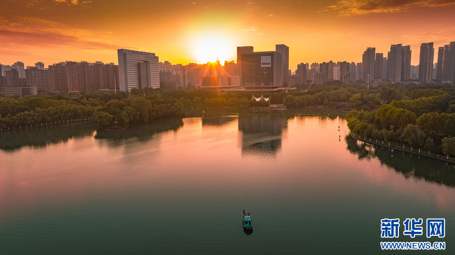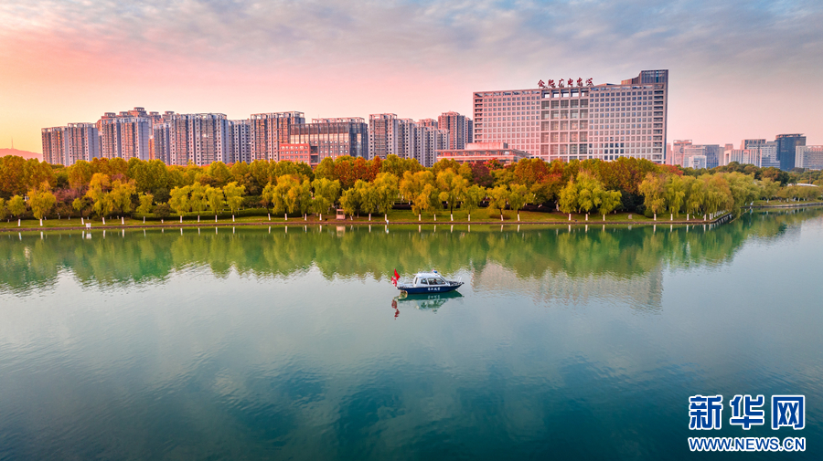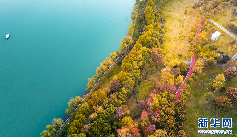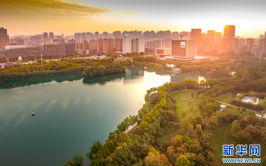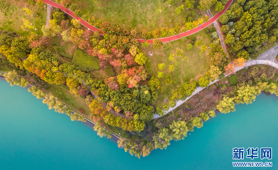 近日,在安徽省合肥市政務(wù)區(qū)天鵝湖畔,層林盡染,景色旖旎。周?chē)臉?shù)木、建筑物,與清澈的湖水交相輝映,渲染成一幅色彩斑斕的迷人畫(huà)卷。新華網(wǎng)發(fā)(劉玉才 攝)