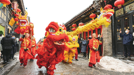 嗨冰雪,覓美食,逛冬景……在大同,除了人們熟知的“夏清涼”,還有“冬康養(yǎng)”。流光溢彩耀平城、魅力冰雪慶豐年等地方特色濃郁、群眾參與度高的文化活動,為人民傾情呈現(xiàn)趣味冰雪和熱鬧年俗、經(jīng)典美食與北國風(fēng)情有機(jī)串聯(lián)的文旅盛宴。如果是春節(jié)期間來到古城,還會與具有獨(dú)特民俗風(fēng)格的演藝活動不期而遇。鄉(xiāng)土氣息十足的街頭吆喝,民俗社火演藝,扭秧歌、劃旱船、背鐵棍、南北獅爭霸賽、山西民歌、八音會、晉劇表演等,讓人目不暇接。正月里的威風(fēng)鑼鼓、秧歌、旱船等傳統(tǒng)民俗節(jié)目,讓游客大飽眼福。