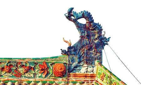 鴟吻又叫鴟尾,是中國古建筑上最常見的一種建筑構件,一般用在古代建筑屋脊正脊兩端作為裝飾。山西永樂宮三清殿的鴟吻造型為龍首魚尾形象,龍頭寬口闊腮,怒目圓睜;腮旁龍牙粗壯強勁,造型夸張;龍身動勢與鴟吻形狀相稱,龍尾處與后爪組成鏤空造型,環(huán)繞在四周的祥云紋和海波紋裝飾,賦予騰龍浮游海天之際的輕盈美,極具動感。