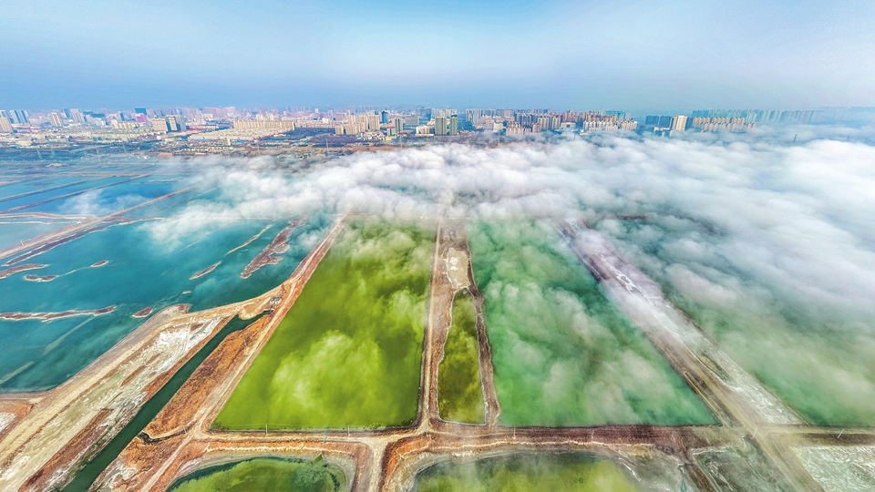 3月11日,因連日來天氣晴好,晝夜溫差大,運城市中心城區(qū)和鹽池上空出現(xiàn)平流霧景觀,七彩的鹽池在霧氣下若隱若現(xiàn),形成一幅無與倫比的美麗畫卷。據(jù)了解,平流霧是沿海暖濕空氣水平流經(jīng)寒冷地面或水面時,導(dǎo)致下部冷卻而形成的云霧。