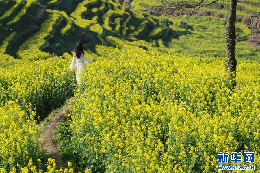 金黃的油菜花盛開如海,花田內(nèi)一片金黃璀璨。新華網(wǎng)發(fā)