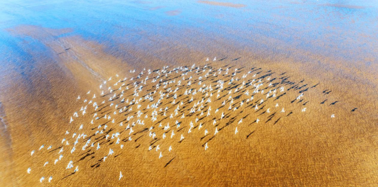 一群海鷗掠過(guò)金沙灘,為海面帶來(lái)了生機(jī)和活力。新華網(wǎng)發(fā)(陳光金 攝)