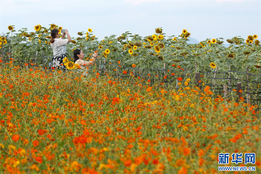 8月1日,游客在安徽省黃山市歙縣石潭古村花海中游玩賞景。