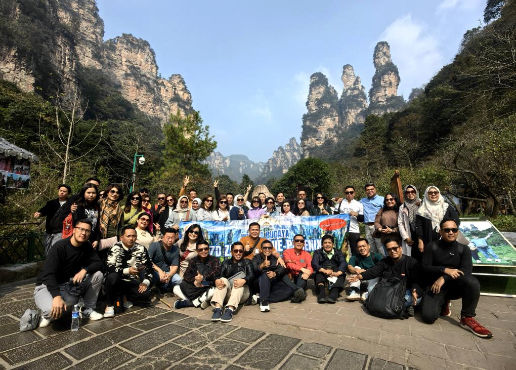11月5日,來自印度尼西亞的團隊游客在張家界國家森林公園留影。(吳勇兵 攝)