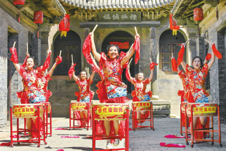 ②4月28日,太谷區(qū)文化館親疙蛋鼓舞隊隊員正在三多堂景區(qū)排練,為即將到來的“五一”假期展演做準(zhǔn)備。