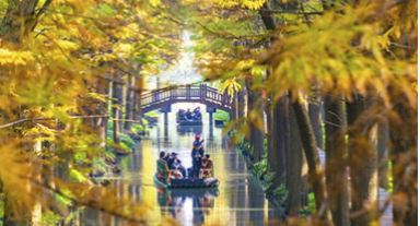 初冬時(shí)節(jié),江蘇興化里下河國(guó)家濕地公園層林盡染、色彩斑斕,如畫美景吸引不少游客前來游玩。周社根攝(人民圖片網(wǎng))