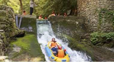 2026年4月25日,位于廣西桂林市陽朔縣興坪鎮(zhèn)的龍頸河景區(qū),游客正在體驗驚險刺激的漂流。黃勝林攝(人民圖片網(wǎng))