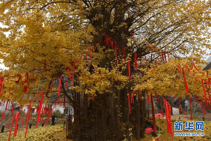 11月19日,游客在留壩縣玉皇廟鎮(zhèn)參觀千年銀杏樹。初冬時(shí)節(jié),在秦嶺深處的陜西省留壩縣玉皇廟鎮(zhèn)石窯壩村,一棵千年古銀杏樹的落葉宛如金色地毯,甚為壯觀。據(jù)當(dāng)?shù)亓謽I(yè)部門介紹,該樹胸徑為4.45米,現(xiàn)有高度29米。新華社記者 陶明 攝