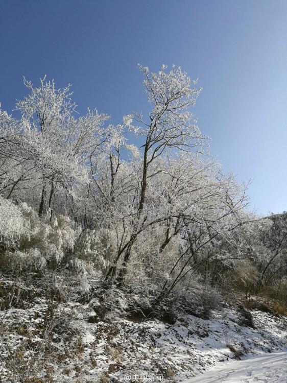 受較強(qiáng)冷空氣影響,秦嶺腹地涼風(fēng)埡山頂,出現(xiàn)大面積霧凇景觀。玉樹瓊枝,晶瑩剔透,讓涼風(fēng)埡山頂變得像童話世界一般,美不勝收。 央視記者王志杰 圖片來源:央視新聞微博
