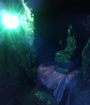 千佛洞,分內(nèi)外兩洞,外洞大而明,內(nèi)洞小而幽,中間有一個扁圓形孔穴相通。內(nèi)洞中,可以容納五至七人。內(nèi)洞的洞壁上,山巖經(jīng)水溶化,產(chǎn)生許多乳石及石筍,夾有各種色質(zhì),猶如人體心肝五臟,洞形又呈葫蘆形狀,后人便稱之為母腹。佛教宣揚進入小洞就是投胎佛母,受其恩育,復(fù)出小洞就是洗掉人生一切煩惱,獲得無上歡樂幸福。