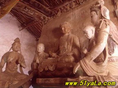 寺前有藏式佛塔一座,高約25米,明代所筑。寺內(nèi)南殿和正殿兩座,均經(jīng)后世修補(bǔ),唯殿內(nèi)塑像和碑刻仍是唐、宋原物。南殿3間,內(nèi)置彩塑12尊,中為釋迦、文殊、普賢、阿難、迦葉,兩側(cè)有觀音、羅漢、韋馱、脅侍、供養(yǎng)人等,造像風(fēng)格與青蓮寺宋代塑像如出一轍。殿內(nèi)《硤石寺大陪遠(yuǎn)法師遺跡記》唐碑一通,寶歷元年(825年)鐫造,碑頭線(xiàn)刻彌勒講經(jīng)圖,山門(mén)、圍廊、佛殿、講壇莫不具備,是研究唐代建筑布局和形制的形象資料。正殿內(nèi)佛壇寬大,上置彩塑7軀,釋迦、文殊、普賢、二弟子及二供養(yǎng)菩薩,皆為唐制,面形豐滿(mǎn),肌肉健美,身式微屈,姿態(tài)自然。 (責(zé)任編輯:李冬梅) |
