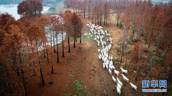 11月27日,牧歸的羊群行走在紅杉林中。