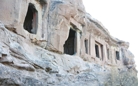 進(jìn)入寺院抬頭仰望,距現(xiàn)地表高約10米的山體上由北向南排列著九座石窟。總體特征皆平面方形,窟頂上部外立面存有窟檐橡孔。沿山崖堆積的土丘登高看到,每窟面積約為2平方米,四壁垂直,頂部為平頂或略帶弧度。第一、三、五窟門楣雕有火焰紋裝飾,門楣內(nèi)雕飛天或花卉,門兩側(cè)設(shè)方形石柱或八棱束蓮柱。一至六窟平面呈長(zhǎng)方形,平頂,四壁平直;七至九窟呈長(zhǎng)方形,拱券頂;中間一孔入口兩側(cè)還刻有石雕小獸,造型生動(dòng)。9窟中除第8窟為未完工的窟室和第7窟推測(cè)為僧房窟外,余下的窟俱為佛殿窟??邇?nèi)三面石壁上都刻有佛像,設(shè)低壇。四壁三龕,每龕一佛二菩薩或一佛二弟子,造像面相豐潤(rùn)、頤頰飽滿。雖年久失修,風(fēng)化嚴(yán)重,但仍能從中領(lǐng)略幾分豪邁灑脫的大唐風(fēng)韻。三至六窟外壁存摩崖碑3通,均為螭首,碑文漫漶不清。據(jù)摩崖碑上“……歲次丁丑七月辛酉朔十五日乙亥建立”字跡記載,雕造于唐儀鳳二年(公元677年)。