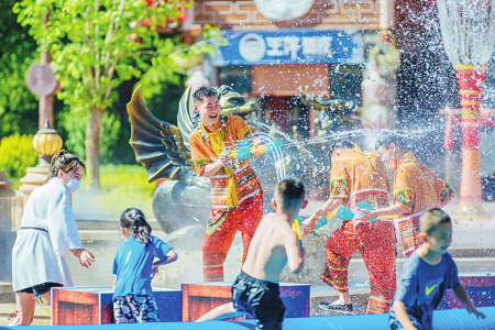 樂園精心打造的充滿濃郁“傣式”風(fēng)情的潑水活動,身著傣族特色服飾的NPC們組成巡游隊(duì)伍,手持水盆、水槍,與沿途游客熱情互動。