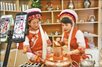 圖為主播在推介銅火鍋。李茂穎 董孟良攝影報(bào)道