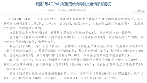 情況顯示,截至8月4日24時,據(jù)31個?。ㄗ灾螀^(qū)、直轄市)和新疆生產(chǎn)建設(shè)兵團報告,現(xiàn)有確診病例810例(其中重癥病例36例),累計治愈出院病例79047例,累計死亡病例4634例,累計報告確診病例84491例,現(xiàn)有疑似病例3例。累計追蹤到密切接觸者794165人,尚在醫(yī)學(xué)觀察的密切接觸者23018人。