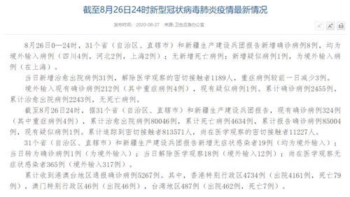 人民網北京8月27日電(董童)國家衛(wèi)生健康委于今日在官網發(fā)布的《截至8月26日24時新型冠狀病毒肺炎疫情最新情況》(以下簡稱“情況”)提出,8月26日0—24時,31個?。ㄗ灾螀^(qū)、直轄市)和新疆生產建設兵團報告新增確診病例8例,均為境外輸入病例(四川4例,河北2例,上海2例);無新增死亡病例;新增疑似病例1例,為境外輸入病例(在上海)。當日新增治愈出院病例31例,解除醫(yī)學觀察的密切接觸者1189人,重癥病例較前一日減少3例。