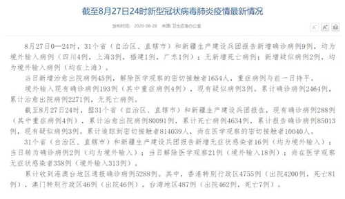 情況顯示,截至8月27日24時(shí),據(jù)31個(gè)?。ㄗ灾螀^(qū)、直轄市)和新疆生產(chǎn)建設(shè)兵團(tuán)報(bào)告,現(xiàn)有確診病例288例(其中重癥病例4例),累計(jì)治愈出院病例80091例,累計(jì)死亡病例4634例,累計(jì)報(bào)告確診病例85013例,現(xiàn)有疑似病例3例。累計(jì)追蹤到密切接觸者814039人,尚在醫(yī)學(xué)觀察的密切接觸者10040人。