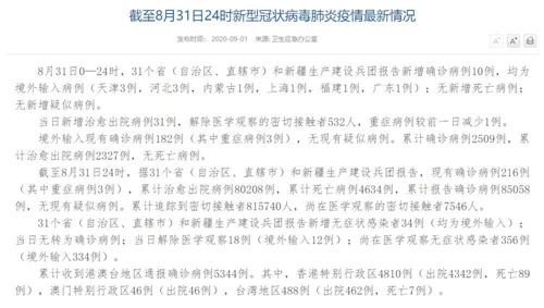 截至8月31日24時(shí),據(jù)31個(gè)省(自治區(qū)、直轄市)和新疆生產(chǎn)建設(shè)兵團(tuán)報(bào)告,現(xiàn)有確診病例216例(其中重癥病例3例),累計(jì)治愈出院病例80208例,累計(jì)死亡病例4634例,累計(jì)報(bào)告確診病例85058例,無現(xiàn)有疑似病例。累計(jì)追蹤到密切接觸者815740人,尚在醫(yī)學(xué)觀察的密切接觸者7546人。
