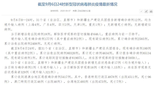 人民網(wǎng)北京9月7日電(董童)國家衛(wèi)生健康委于今日在官網(wǎng)發(fā)布的《截至9月6日24時(shí)新型冠狀病毒肺炎疫情最新情況》(以下簡稱“情況”)提出,9月6日0—24時(shí),31個(gè)省(自治區(qū)、直轄市)和新疆生產(chǎn)建設(shè)兵團(tuán)報(bào)告新增確診病例12例,均為境外輸入病例(上海4例,廣東4例,四川2例,天津1例,重慶1例);無新增死亡病例;無新增疑似病例。當(dāng)日新增治愈出院病例18例,解除醫(yī)學(xué)觀察的密切接觸者646人,重癥病例與前一日持平。