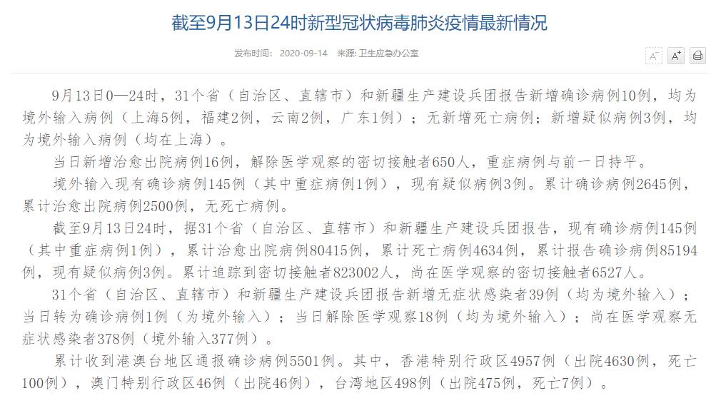 人民網(wǎng)北京9月14日(董童)國(guó)家衛(wèi)生健康委于今日在官網(wǎng)發(fā)布的《截至9月13日24時(shí)新型冠狀病毒肺炎疫情最新情況》(以下簡(jiǎn)稱“情況”)提出,9月13日0—24時(shí),31個(gè)?。ㄗ灾螀^(qū)、直轄市)和新疆生產(chǎn)建設(shè)兵團(tuán)報(bào)告新增確診病例10例,均為境外輸入病例(上海5例,福建2例,云南2例,廣東1例);無(wú)新增死亡病例;新增疑似病例3例,均為境外輸入病例(均在上海)。當(dāng)日新增治愈出院病例16例,解除醫(yī)學(xué)觀察的密切接觸者650人,重癥病例與前一日持平。