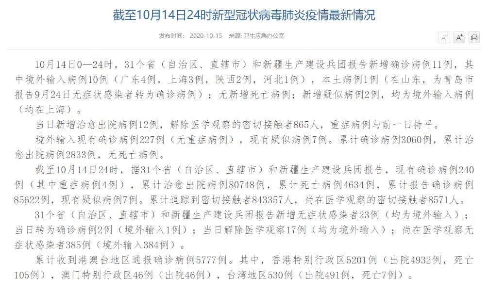 人民網(wǎng)北京10月15日電(董童)國家衛(wèi)生健康委于今日在官網(wǎng)發(fā)布的《截至10月14日24時(shí)新型冠狀病毒肺炎疫情最新情況》(以下簡稱“情況”)提出,10月14日0—24時(shí),31個(gè)省(自治區(qū)、直轄市)和新疆生產(chǎn)建設(shè)兵團(tuán)報(bào)告新增確診病例11例,其中境外輸入病例10例(廣東4例,上海3例,陜西2例,河北1例),本土病例1例(在山東,為青島市報(bào)告9月24日無癥狀感染者轉(zhuǎn)為確診病例);無新增死亡病例;新增疑似病例2例,均為境外輸入病例(均在上海)。當(dāng)日新增治愈出院病例12例,解除醫(yī)學(xué)觀察的密切接觸者865人,重癥病例與前一日持平。