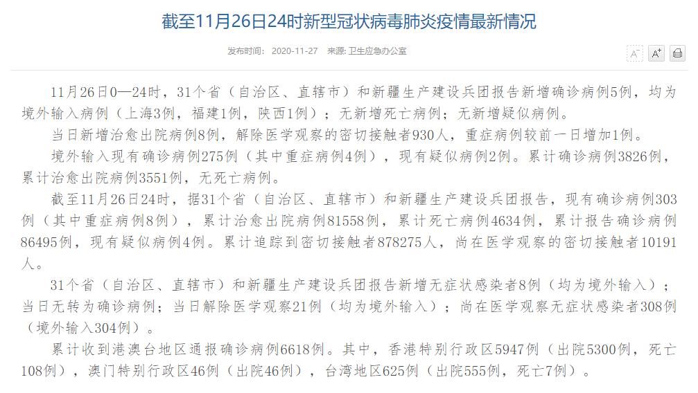 情況顯示,截至11月26日24時,據(jù)31個?。ㄗ灾螀^(qū)、直轄市)和新疆生產(chǎn)建設(shè)兵團報告,現(xiàn)有確診病例303例(其中重癥病例8例),累計治愈出院病例81558例,累計死亡病例4634例,累計報告確診病例86495例,現(xiàn)有疑似病例4例。累計追蹤到密切接觸者878275人,尚在醫(yī)學(xué)觀察的密切接觸者10191人。