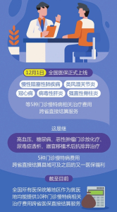 記者從國家醫(yī)保局了解到,12月1日,全國醫(yī)保正式上線慢性阻塞性肺疾病、類風(fēng)濕關(guān)節(jié)炎、冠心病、病毒性肝炎、強直性脊柱炎等5種門診慢特病相關(guān)治療費用跨省直接結(jié)算服務(wù)。