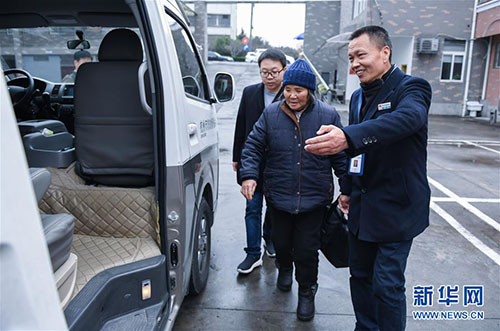 李耀進(右)在杭州市救助管理站送一名需要被救助的老人去車站乘車回家(2018年12月27日)。 新華社記者 徐昱 攝