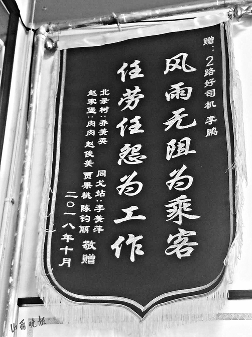 撿到東西歸還失主,失主送來表揚(yáng)信比較常見,山西晚報(bào)記者發(fā)現(xiàn)有一張比較例外。一位署名“2路乘客”的感謝信中這樣寫道:“2017年以前,可以說偶爾坐2路,因?yàn)榻?jīng)常會(huì)有等不上車的情況。但自從李鵬接上2路以后,基本上沒出現(xiàn)過等不上車的情況……作為長(zhǎng)期乘坐公交的乘客真心非常感謝……”錦旗是7名乘客集體送的,“風(fēng)雨無阻為乘客,任勞任怨為工作”,14個(gè)字,表達(dá)的是乘客對(duì)李鵬的認(rèn)可。