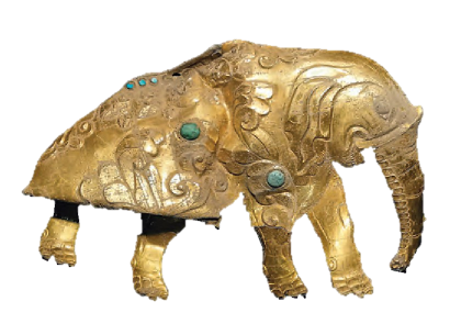血渭一號墓出土的鑲綠松石金象飾片(中國社科院考古所供圖)
