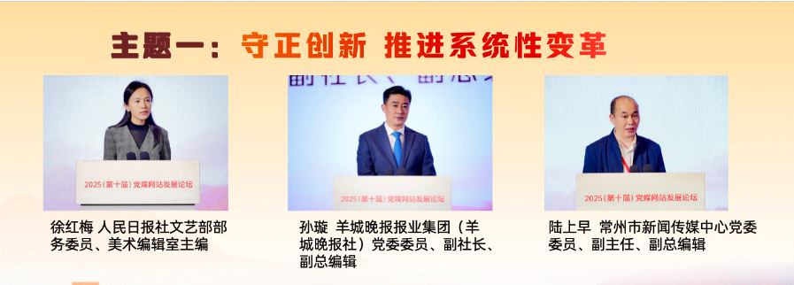 在“守正創(chuàng)新 推進(jìn)系統(tǒng)性變革”主題研討環(huán)節(jié),人民日報社文藝部部務(wù)委員、美術(shù)編輯室主編徐紅梅,羊城晚報報業(yè)集團(tuán)(羊城晚報社)黨委委員、副社長、副總編輯孫璇,常州市新聞傳媒中心黨委委員、副主任、副總編輯陸上早分別作主旨發(fā)言,介紹了各自領(lǐng)域推進(jìn)系統(tǒng)性變革、發(fā)展新時代中國特色社會主義文化的實踐與探索。徐紅梅表示,“每日讀畫”采取“AI+美術(shù)”“微視頻+夜讀”的形式,堅持“讀準(zhǔn)、讀細(xì)、讀新、讀美”,讓AI成為深入畫境、開啟古今對話的共創(chuàng)者,以動態(tài)轉(zhuǎn)譯、意境擴(kuò)展、流程再造、視聽融合開發(fā)美術(shù)融媒的敘事潛能,深入挖掘中華文明賡續(xù)傳承的基因密碼,成為探索主流媒體系統(tǒng)性變革的微觀樣本。孫璇表示,羊城晚報全面啟動系統(tǒng)性變革,以做強(qiáng)媒體、文化、數(shù)據(jù)、產(chǎn)業(yè)四個戰(zhàn)略板塊為重點,把“技術(shù)賦能”嵌入系統(tǒng)性變革各關(guān)鍵板塊,積極增強(qiáng)文化傳播、促進(jìn)文化交流和繁榮文化生產(chǎn)。陸上早表示,常州借“蘇超”東風(fēng),走出城市轉(zhuǎn)型與能級躍升之路。改革的推進(jìn)需聚焦六大方向:組織體系化,內(nèi)容精品化,傳播移動化,技術(shù)現(xiàn)代化,分配績效化,干部年輕化。