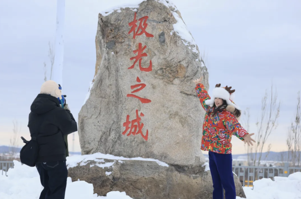 游客在漠河站站前廣場(chǎng)與“極光之城”碑打卡。新華社發(fā)(徐率攝)