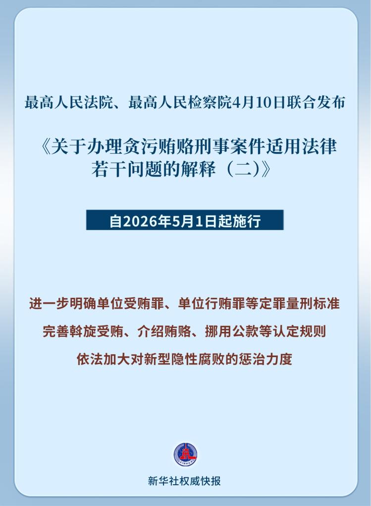最高人民法院、最高人民檢察院4月10日聯(lián)合發(fā)布《關(guān)于辦理貪污賄賂刑事案件適用法律若干問題的解釋(二)》,自2026年5月1日起施行。