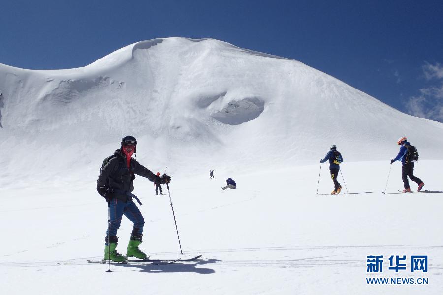 ↑記者第一次見(jiàn)到劉百靈是在第十六屆西藏登山大會(huì)滑雪登山項(xiàng)目的營(yíng)地——洛堆峰雪線處,海拔5600米。劉百靈膚色黑得發(fā)亮,與身邊長(zhǎng)年從事高山訓(xùn)練的藏族教練無(wú)異。但細(xì)問(wèn)起來(lái),他說(shuō)自己生在湖南,現(xiàn)居杭州,是地道的南方人。 因?yàn)閷?duì)戶外運(yùn)動(dòng)尤其是對(duì)滑雪的執(zhí)著,劉百靈的膚色變了,過(guò)起了旁人眼中的另一種人生,也成了“異類”。但他卻感謝自己成了“異類”。這是10月4日,滑雪愛(ài)好者、“體育旅游”探索者劉百靈(左)在位于西藏自治區(qū)當(dāng)雄縣羊八井鎮(zhèn)的洛堆峰雪坡上練習(xí),此處海拔約5700米。遠(yuǎn)處的山峰是海拔7048米的窮母崗日峰。 新華社發(fā)