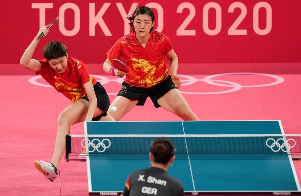 8月4日,中國隊組合王曼昱(左)/陳夢在比賽中。新華社記者劉大偉攝