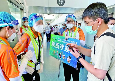 9月14日,在西安咸陽機場,工作人員為參加全運會的記者提供服務(wù)。本報記者 郭紅松攝/光明圖片