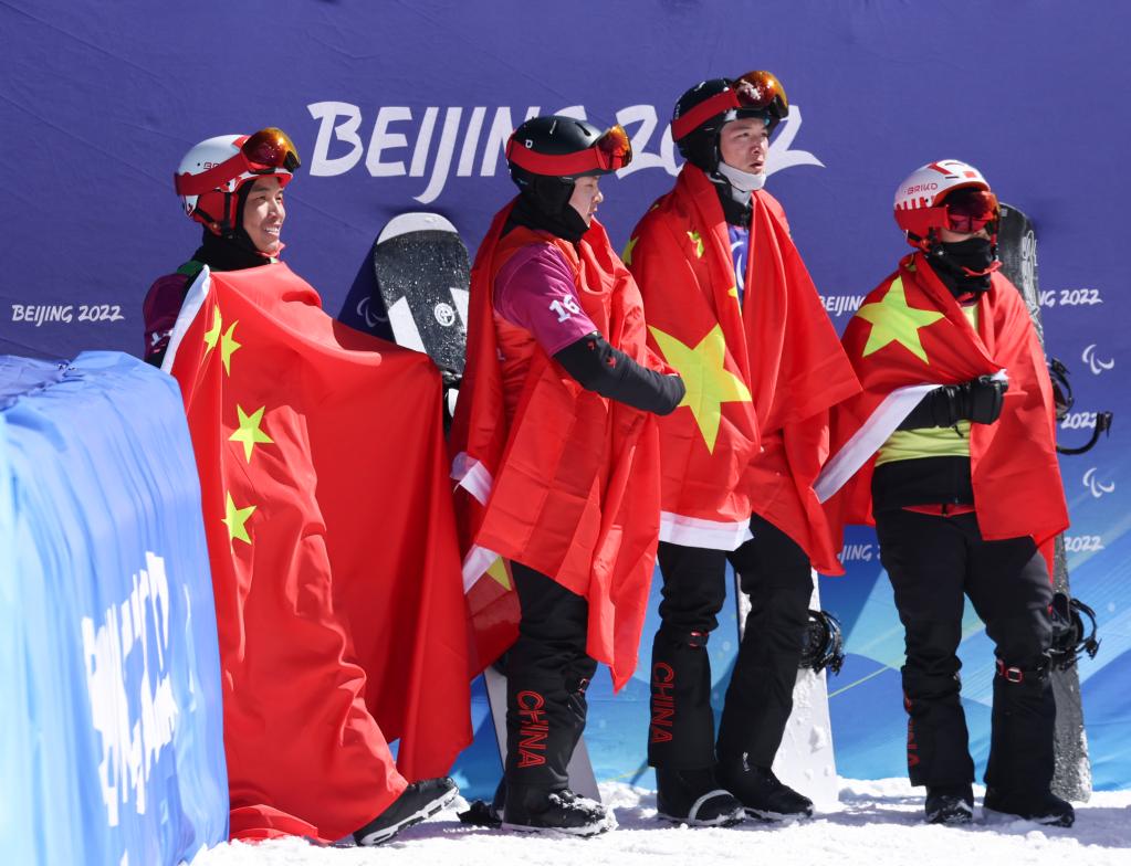 四面五星紅旗分別披在四位選手身上,他們享受著來自場內(nèi)四面八方的歡呼。他們的名字是紀(jì)立家、王鵬耀、朱永鋼、張義琦,他們是北京冬殘奧會(huì)殘奧單板滑雪男子障礙追逐UL級(jí)比賽大決賽的全部四名參賽選手,冠亞季殿軍獲得者。