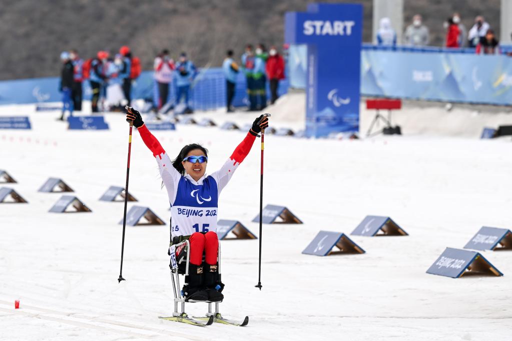 3月9日,中國(guó)楊洪瓊獲得北京冬殘奧會(huì)殘奧越野滑雪女子短距離(坐姿)冠軍。新華社記者李博攝
