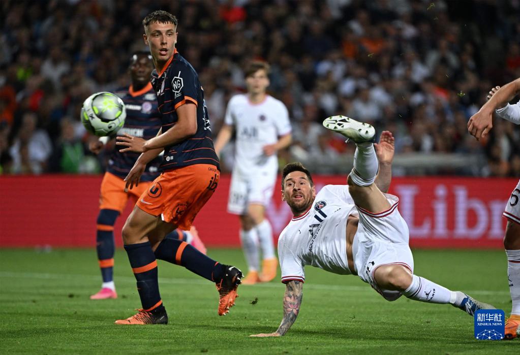 5月14日,巴黎圣日耳曼隊(duì)球員梅西(右)在2021-2022賽季法國(guó)足球甲級(jí)聯(lián)賽第37輪比賽中。新華社/法新