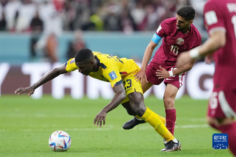 11月20日,厄瓜多爾隊球員莫伊塞斯·凱塞多(左)與卡塔爾隊球員哈桑·海多斯在比賽中拼搶。新華社記者 鄭煥松 攝