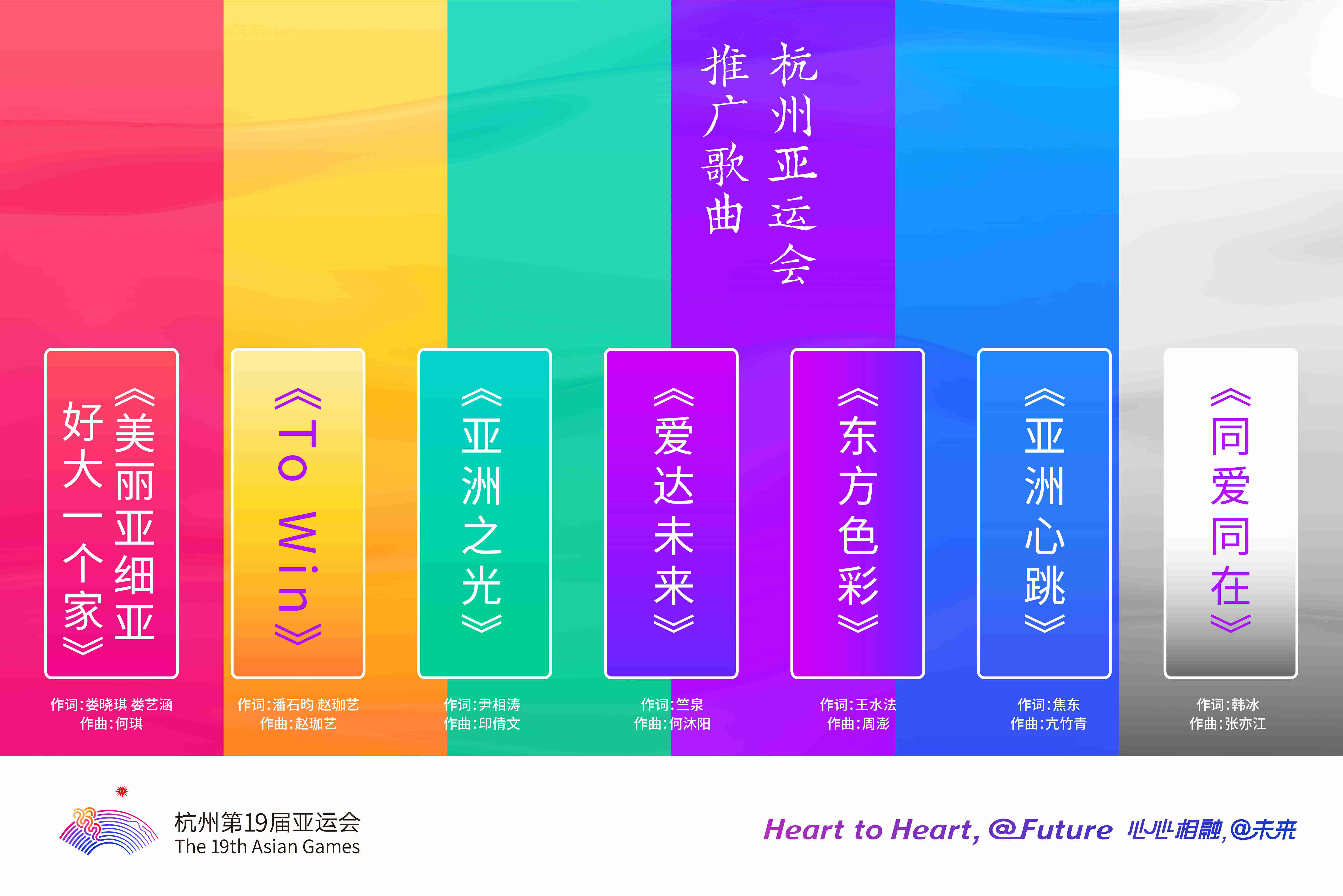 此次發(fā)布的《同愛同在》《亞洲心跳》《東方色彩》《愛達未來》《亞洲之光》《To Win》《美麗亞細亞 好大一個家》七首杭州亞運會推廣歌曲彰顯了不同的音樂風(fēng)格,傳遞對亞運盛會的祝福和期待。