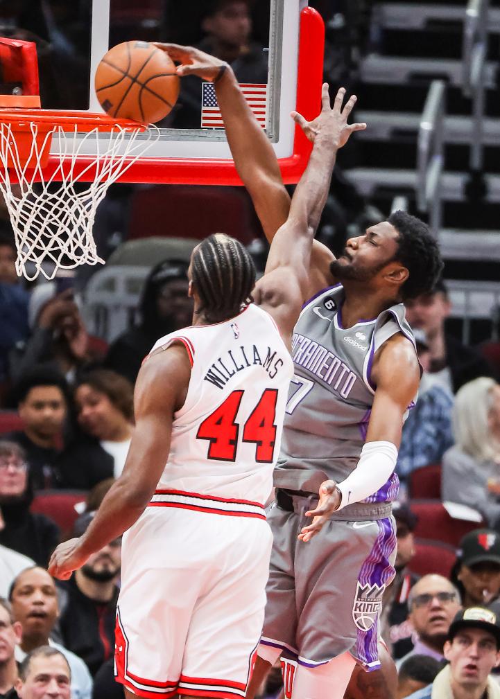 3月15日,效力于薩克拉門托國王隊的愛德華茲(右)在比賽中扣籃。當(dāng)日,在2022-2023賽季NBA常規(guī)賽中,薩克拉門托國王隊客場以117:114戰(zhàn)勝芝加哥公牛隊。新華社發(fā)(喬爾·萊納攝)